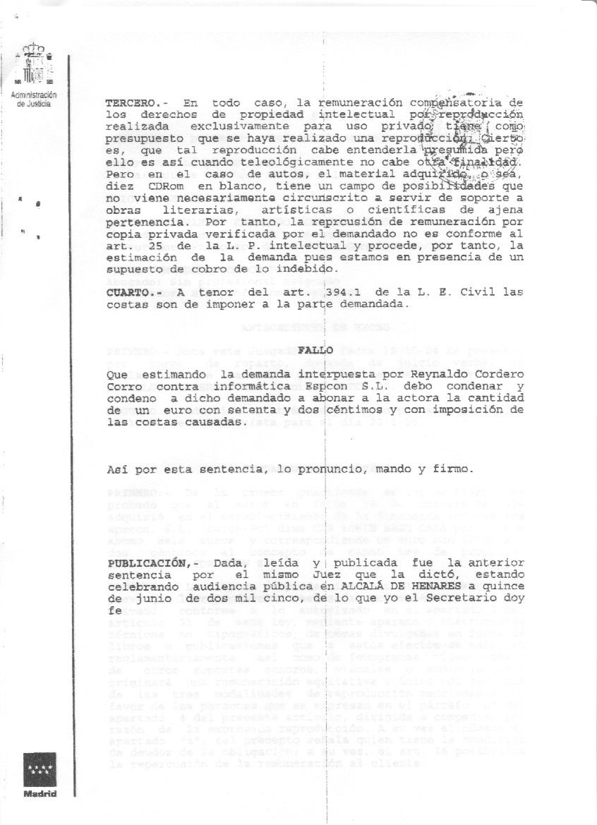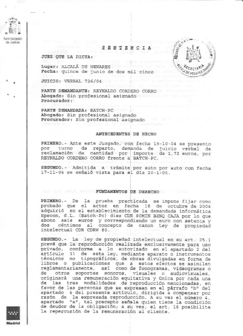 Un juzgado de primera instancia de Alcalá de Henares ha dado la razón, en una sentencia histórica, a Reynaldo Cordero (otro luchador por los derechos digitales) en el juicio que (siguiendo el plan trazado por Javier de la Cueva) inició para conseguir que se le devolviese el importe del canon. Ahora vendrán los recursos, las altas instancias, etc, etc. El plan es que haya muchas demandas, muchas sentencias, y al final el Tribunal Constitucional declare lo que nosotros ya sabemos hace tiempo: que el “canon digital” es injusto, indiscriminado e ilegal.